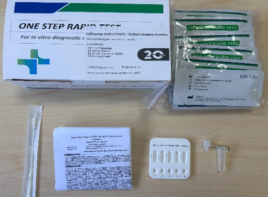 El dispositivo de prueba rápida de antígeno de influenza A+B/COVID-19/RSV/Adenovirus es un Inmunoensayo visual rápido para la detección cualitativa y presunta de influenza A y antígenos virales B, antígeno COVID-19, antígeno Virus Sincitial y antígeno Adenovirus. Sensibilidad relativa: 99.7. Especificidad relativa : 99.8. Intervalo de confianza 95.0%